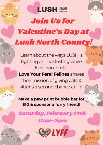 Celebrate love this Valentine’s Day with LUSH North County and Love Your Feral Felines! Join us for a feel-good afternoon dedicated to compassion, cruelty-free beauty, and giving back to our furry friends.